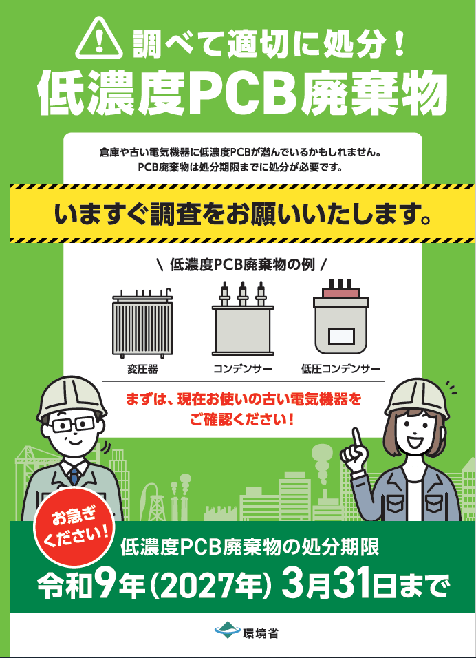 PCB廃棄物の処理期限は、令和9年(2027年)3月31日までとなっており、同日までに無害化処理認定施設にて処理を完了する必要がございます。